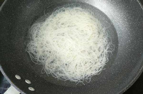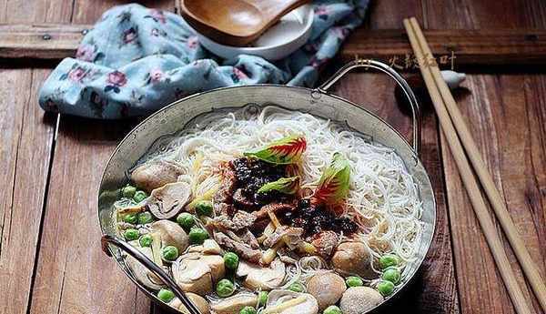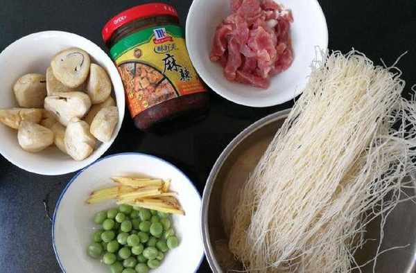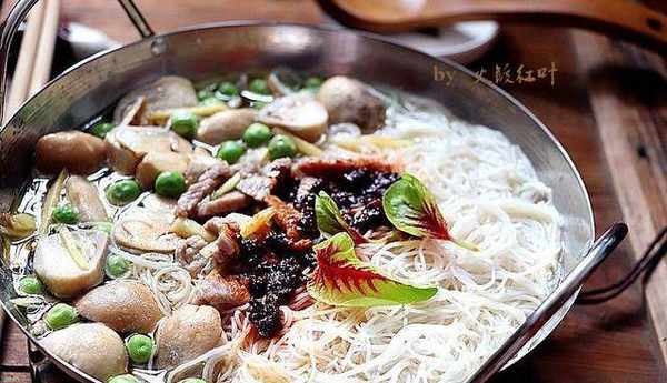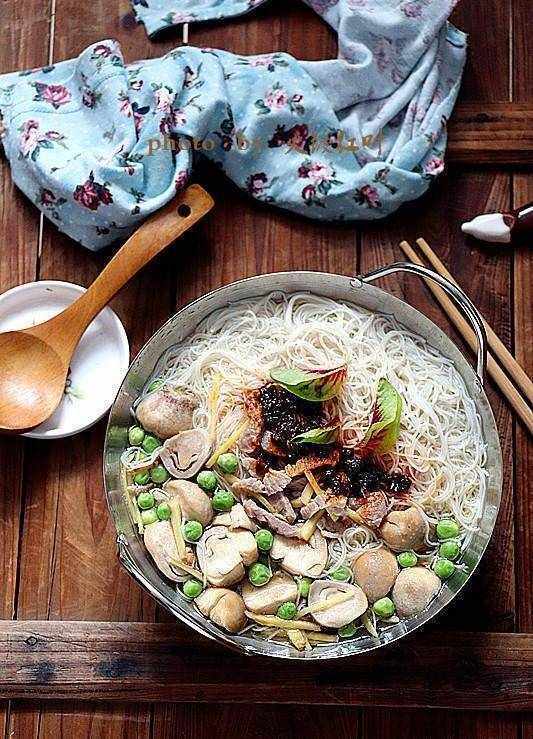 材料:干米粉80克,瘦肉30克,草菇1碗,青豆20克,姜丝1匙