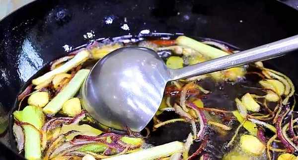 第四步:切半个洋葱,半颗大葱,少许的蒜片和姜片,锅中开小火预热,把葱姜蒜洋葱放进去慢炸,一分钟以后把准备大料放进去(白果、香叶、桂皮、八角),炸至葱段发黄无水分后全部捞出,然后开大火将油再次煮至八成热。
