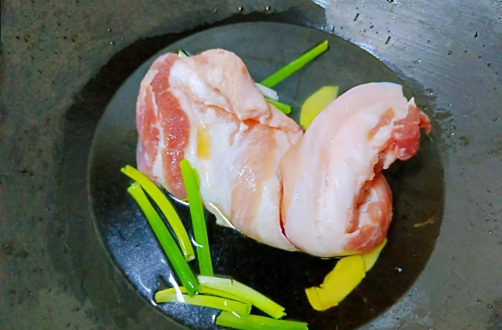 ①我们把五花肉一起干净放入锅中,加冷水没过。加入料酒、葱、姜去腥,开大火煮。等锅表面有很多浮沫时,捞出来,再取出五花肉,用温水冲洗干净,切成小块。