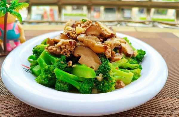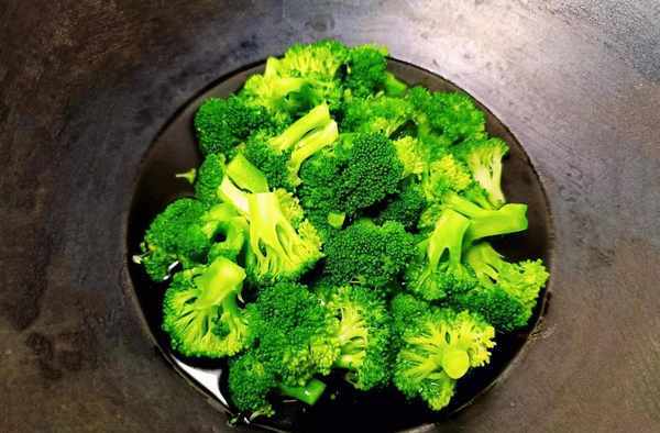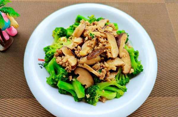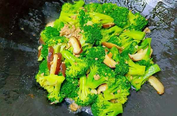 ⑤等香菇炒得有点软的时候倒入西蓝花爆炒。