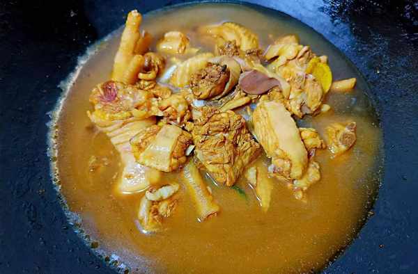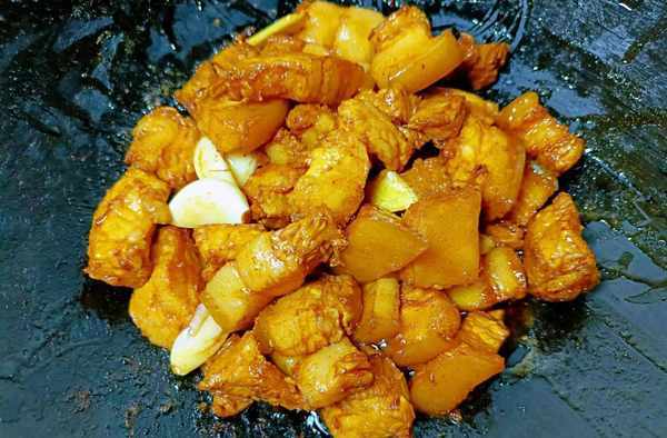 ②锅中烧油,倒入鸡块炒。等鸡块表面水分炒干后加入料酒、生抽、老抽、老醋去腥上色,焖煮3分钟。加入蒜子、姜片、八角、香叶、蒜子翻炒去腥,再加入开水没过鸡块。开大火煮,水开后改成中小火煮。