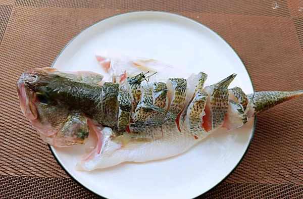 ②鲈鱼腌制好后用水冲洗几次,沥干水分。把鱼背部用刀切几刀,便于入味。把盘子底部铺上大葱葱白和姜片,再把鲈鱼平铺在葱姜上面。