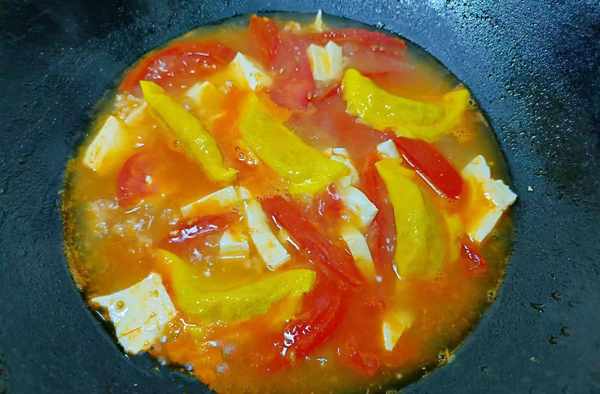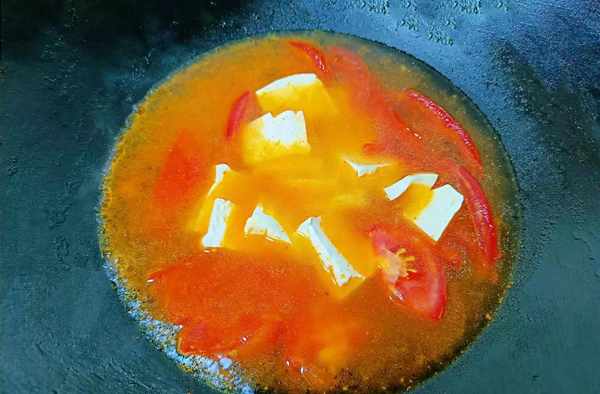 ②待煸炒出西红柿的汁后倒入开水,开大火煮。水开后再倒入泡过淡盐水的豆腐,大火煮开。