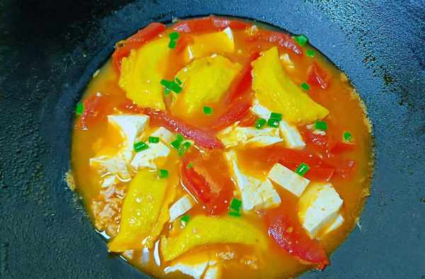 食材:番茄1个、豆腐100克、蛋饺子100克、盐、食用油、葱