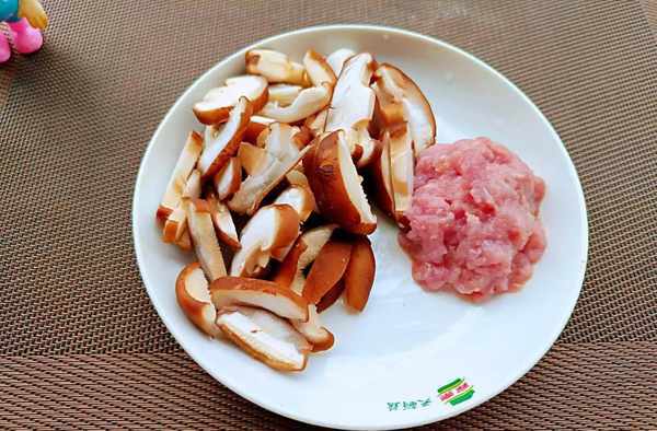 ②去掉香菇的蒂部,把菌帽泡入水中5分钟。搓洗干净表面,切成小块。瘦肉洗干净,剁成肉末。加入一点葱姜水、淀粉、生抽拌一拌,腌制几分钟。