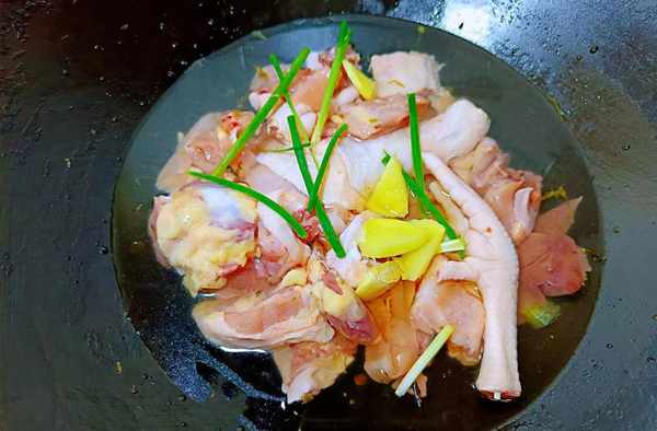 ①我们把鸡剁成小块,泡入冷水中30分钟。多次搓洗后倒入锅中,加水没过。再加入料酒、葱、姜去腥,开大火煮。等锅表面有很多浮沫时捞出来,用温水冲洗干净。