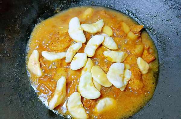 ⑤待五花肉可以用筷子插进去时倒入菱角,再加盐调味,继续焖煮。