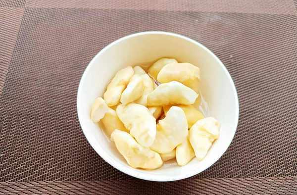 ②用剪刀把菱角两头剪掉,再剪掉中间凸起部分,然后掰开菱角壳。把菱角果肉搓洗几次,泡入水中,防止氧化发黑。