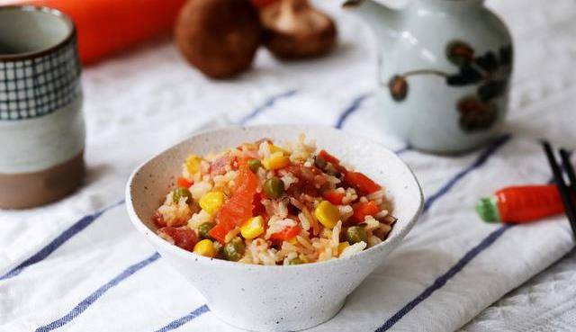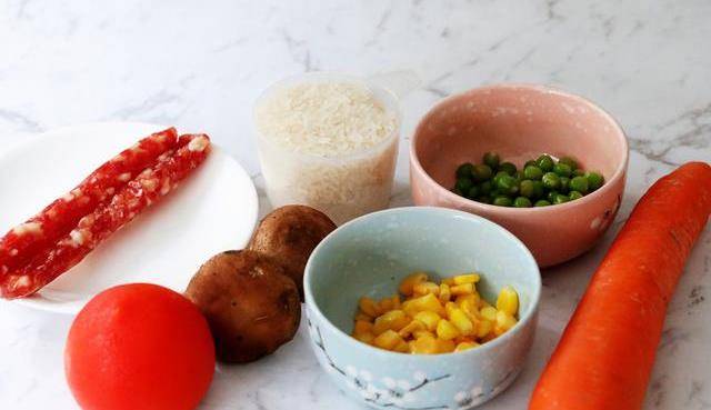 所需材料:大米150克,玉米粒50克,豌豆50克,胡萝卜50克,香菇2个,腊肠2条,番茄1个,盐1克,香油1勺,生抽1勺,清水适量