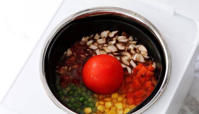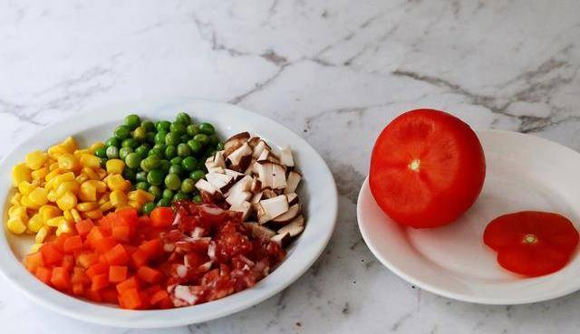 制作过程:1、玉米粒和豌豆洗净,胡萝卜去皮洗净切丁,香菇去蒂洗净切丁,腊肠切丁,番茄洗净切去顶部,如图所示