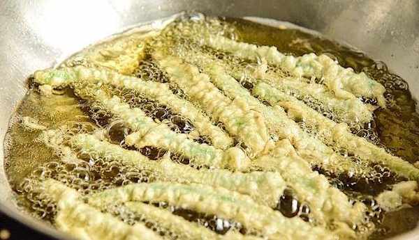 6、锅中倒入适量食用油烧至7分热,下入豆角段,炸至金黄色即可完成了。刚出锅的豆角最是美味了,外壳酥脆可口,内芯软嫩鲜香。也可以搭配椒盐一起食用哦。