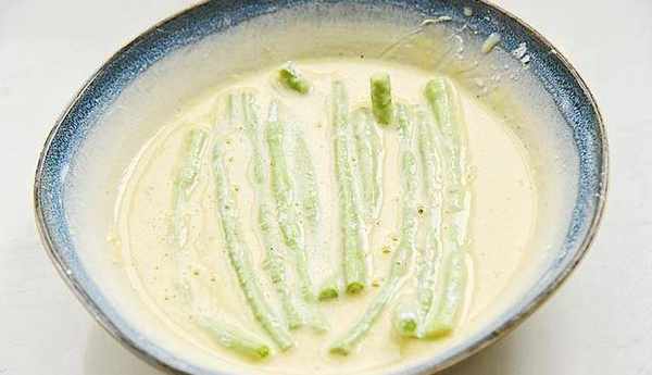 5、再把豆角段放入面糊中,都挂上一层面糊。