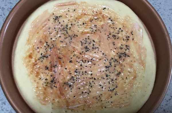 8、然后,用刷子蘸取适量的番茄酱和沙拉酱,均匀地刷在饼胚上,再撒上适量的黑胡椒碎。