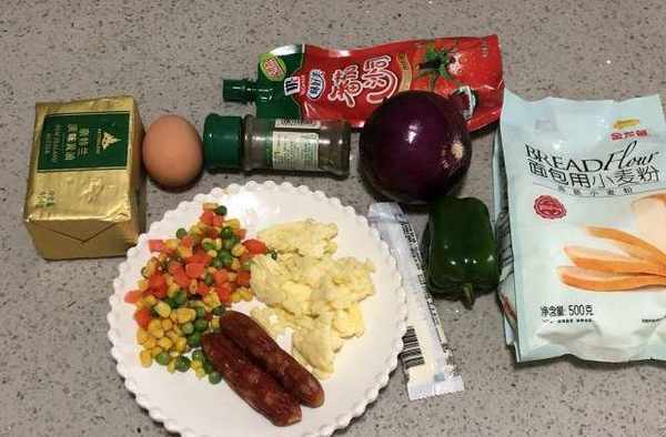 【食材】:高筋面粉200克、鸡蛋一个、清水90克、酵母3克、白砂糖20克、黄油15克、腊肉肠2根、时蔬30克、马苏里拉芝士碎50克、番茄酱10克、沙拉酱15克、洋葱半个、青椒半个、黑胡椒碎适量。