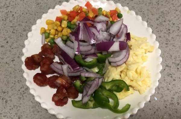 2、接下来,用刀将洋葱、青椒和腊肉肠分别切好,放到盘中待用。