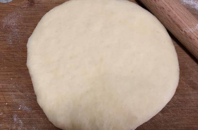 6、之后,取出发酵好的面团,用擀面杖将其擀成一个圆形,和烤盘尺寸接近即可,我用的是9寸的披萨烤盘。