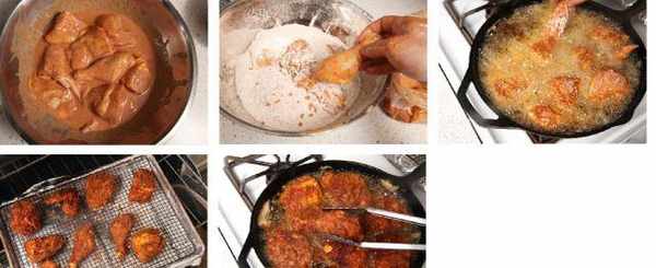 7将煮熟的鸡肉放在冰箱中至少1小时,最多过夜。准备使用时,将油重新加热到400°F。加入鸡肉块,煮熟,在烹饪过程中将其翻转一次,直到完全酥脆,大约5分钟。转移到设置在有框烤盘上的电线架上沥干水分,然后立即食用。