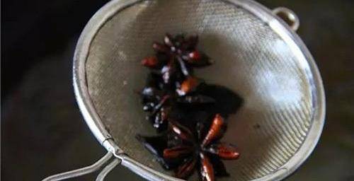 将准备好的菜籽油放入锅中,用小火慢慢加热。放入桂皮和八角,用小火慢慢炸,炸出香味。油温慢慢升高,八角和桂皮会变成黑色,这个时候用漏勺将八角和桂皮捞出来扔了。