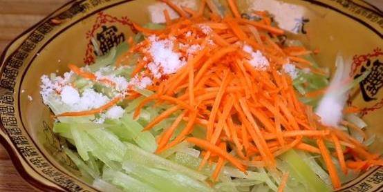 3、把准备好的胡萝卜先清洗干净,然后去掉外皮,再将它擦成细丝,同样是放到碗中,然后加上适量的食盐,用手将食盐,莴笋丝和葫芦丝抓拌均匀,放到一旁腌制10分钟,腌制出它们里面多余的水分,这样吃起来会更加清脆,然后把咱们准备好的面粉取出来,放到一个大碗中,加入一克食盐,并搅拌均匀,倒入适量的温水搅成絮状。