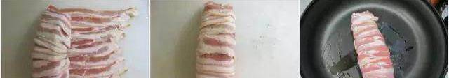 2、然后将培根紧紧卷在三文鱼外面,然后锅中倒一点点油(防粘),然后把培根卷放到锅里中火煎四面;