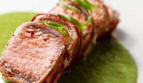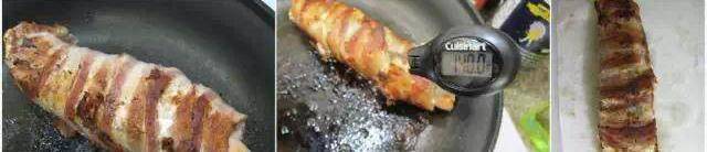 3、等到四面的培根都煎熟之后,鱼肉基本也就熟了,不过可以用温度计测一下内部温度,需要在140°F(60°C)以上。然后可以取出鱼卷,放凉一点,用厨房纸吸除多余的油;