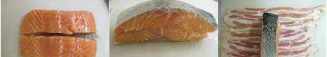 1、首先将三文鱼清洗干净,从中间切开,可以加一些黑胡椒调味(盐就不需要了,培根有咸味的),然后头尾对调叠在一起。将培根平铺,中间放上三文鱼块;