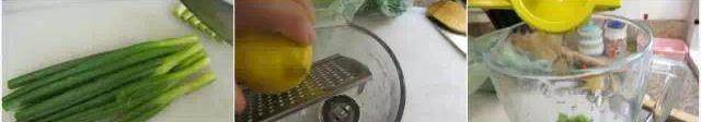 4、将香葱只取葱绿部分,切成小段,搅拌机中先削入柠檬屑,放入香葱,再挤入柠檬汁;
