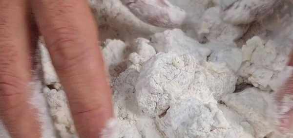 6.腌制好的肉丁放入粉中,让它们均匀裹上粉糯,然后抖散取出来。