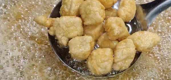 7.起锅倒油,油烧到7成热,下入肉丁,转小火炸。