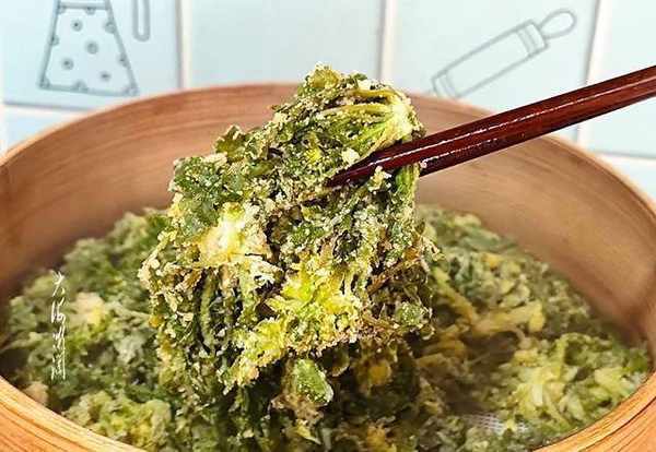 锅中加入适量的水,大火烧开,把拌好的荠菜放进蒸屉,摊平,别摊厚了,然后大火蒸8分钟左右。时间到,打开锅盖,嫩绿的颜色看着就有食欲吧,好吃又饱腹,还能美容养颜。