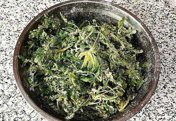 做法:荠菜反复清洗干净,用冷水浸泡半小时左右更水嫩。玉米面和面粉按照1:1的比例混合均匀,荠菜很小,不用切,大棵的可以把它撕开,慢慢的添加到荠菜里,注意一次不要添加太多,边添加边搅拌,使荠菜均匀的裹上面粉。