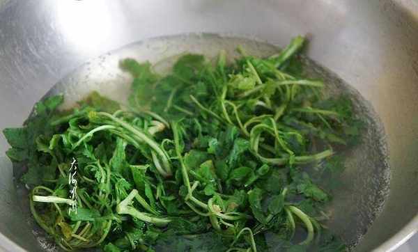 新鲜的荠菜摘洗干净,野菜没有污染,冷水浸泡一会再清洗干净即可,锅中加入适量的水,水开加一勺盐,加盐的目的是保持荠菜的鲜艳度。然后下入荠菜焯水,变色后即可捞出过冷水,切碎攥掉水分。