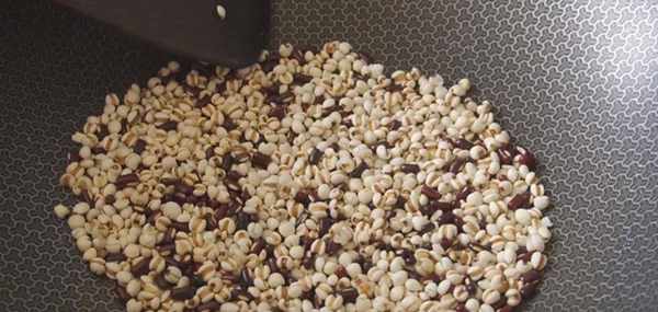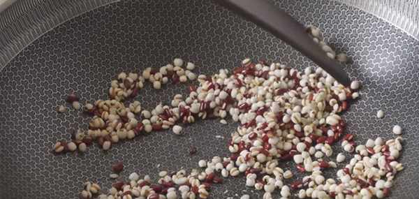 3:锅热下入薏米赤小豆,用小火翻炒均匀,期间不停翻炒,把水分给炒干。