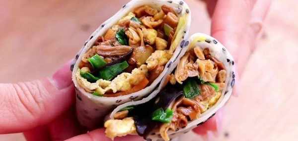 8:取出1张芝麻饼,放上炒熟后的蔬菜,从一端卷成卷就做好了。