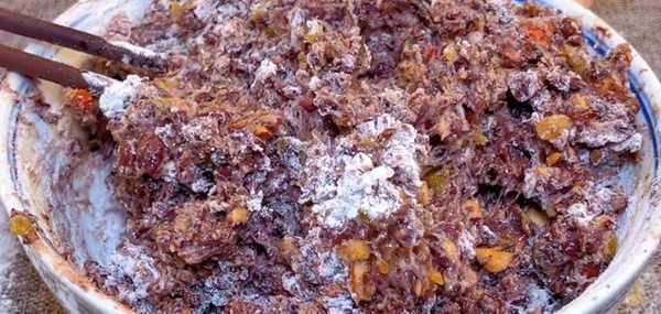 6:接着加入2大勺面粉,用筷子搅拌均匀,搅成这样子就可以了。