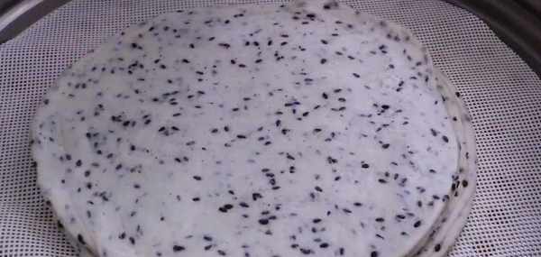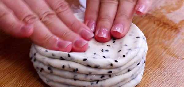 6:时间到后,把芝麻球按压成面皮,以此类推,继续做出几张面皮。