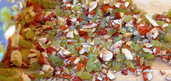 4:红豆、葡萄干清洗干净,红枣去掉果核,再用刀切碎,装入碗中备用。