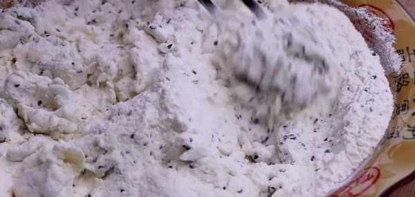 1:碗中加入100克面粉、100克黑芝麻,撒入1勺食盐,搅拌均匀。