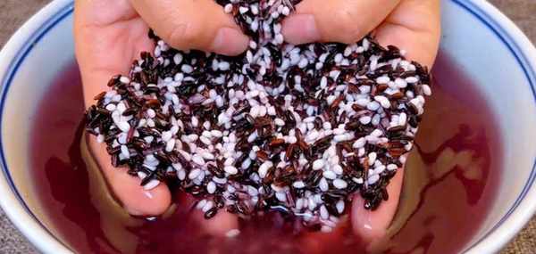 2:各准备50克黑米、紫米、糯米,放入碗中,倒入清水,清洗干净。