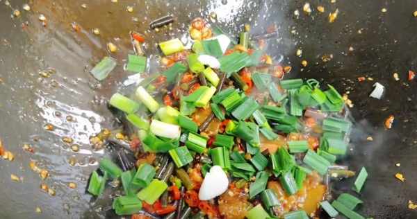 第7步、最后放入大蒜叶段,翻炒几下就可以出锅了。