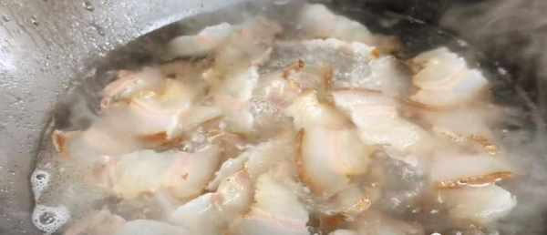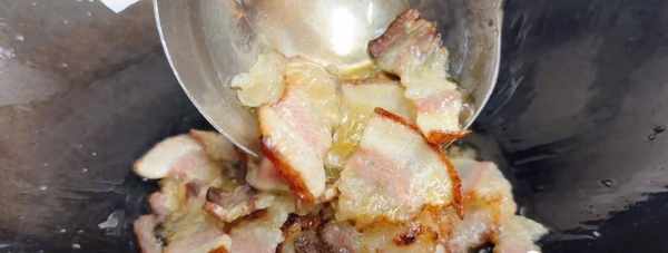 第4步、重新起锅热油,油热后,放入腊肉煸炒出油脂,炒至如下图即可捞出备用,剩下的油留着锅中。