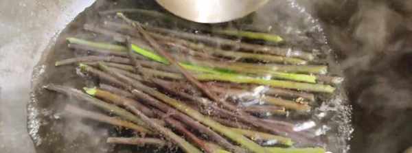 第1步、首先把蕨菜处理好,去头和比较老的尾部,然后再起锅烧水,水开后,加入一勺食盐,再进行焯水1分钟左右,焯水除了可以去掉绒还能去掉涩味。