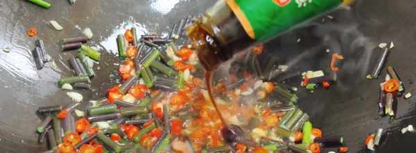 第6步、翻炒几下后,再放入炒好的腊肉,继续的翻炒几下,再加入少许的老抽上色,和一点点的鸡精。