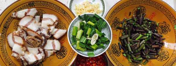 第2步、把焯水好的蕨菜清洗干净后过凉水过凉,再将其切成小段,然后再准备好切成片的腊肉,再备上配料,葱段,辣椒,蒜米。