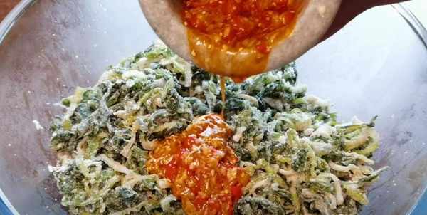 第4步、再然后放入普通的面粉即可,少量多次的放入进行搅拌均匀,让每根叶子上都裹上面粉就可以了,而且还是松散的状态。