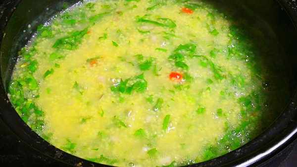 4.小米继续煮20左右分钟后加入适量的蘑菇丁、胡萝卜丁、枸杞点缀颜色、增加营养,继续煮5分钟后再加入适量的盐调味,倒入蒲公英继续煮30秒就可以出锅啦,鲜香美味!