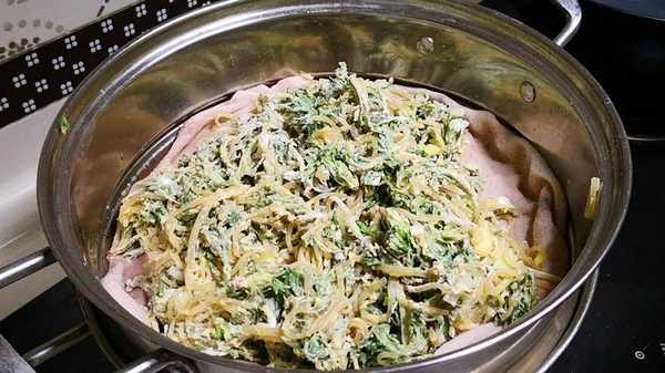 3.锅中加水,放入打湿的笼布,然后再将白蒿和粉条放入摊平,盖好锅盖开始蒸。
