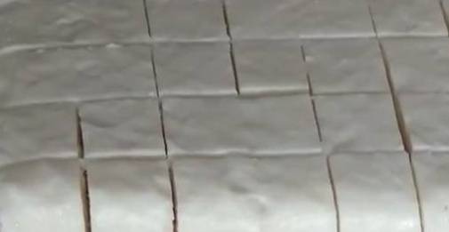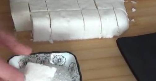 去掉保鲜膜后将牛奶切成一个个大小均等的牛奶块。