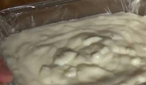 关火,放凉.在保鲜盒里铺上一层保鲜膜.把放凉的牛奶糊倒进保险盒里.轻轻抖几下。