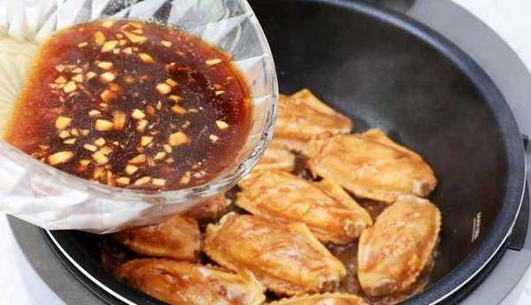 3、自动炒菜机起锅热油,放入鸡翅煎至两面金黄色,倒入腌制鸡翅的酱汁,盖上锅盖,选择红烧程序,焖煮15分钟即可,出锅前撒上熟白芝麻即可
